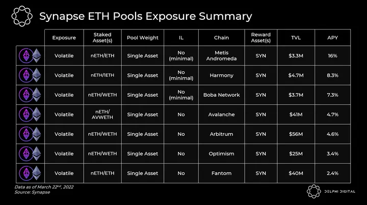 - Emissions: The SYN token has a max supply of 250,000,000. Current SYN emissions are around 296k per week (close down to 75% since the launch of Synapse in September 2021).