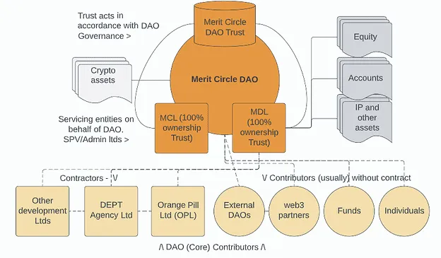 - Merit Circle has also voted to restructure its DAO. This proposal formalizes the relationship between the $MC Purpose Trust, Merit Circle Limited, MCDAO Ltd, and Orange Pill Ltd. Orange Pill is a contracted company with no ownership in the DAO, which will carry out the day-to-day operations.