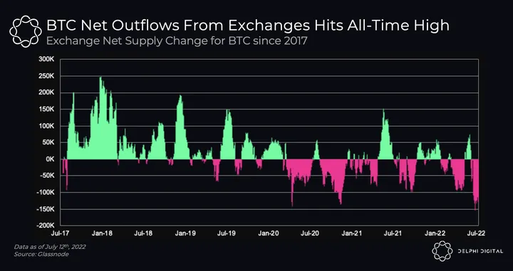 - Since the start of 2020, BTC outflows from exchanges have far outpaced BTC inflows, with a sharp increase between June and July 2022.