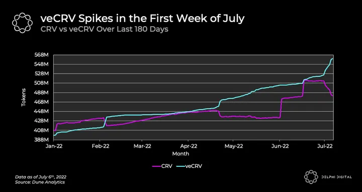 - The average lock rate of veCRV is often a good sentiment indicator for Curve. Because veCRV is held by those with a long-term interest in the protocol, monitoring the accumulation of veCRV and significant unlocks will often bring insight into CRV price movements. In the first week of July, the rate of locked CRV saw a significant increase – as did the price of CRV by 40.7%. This is likely attributed to a recent proposal from Frax.