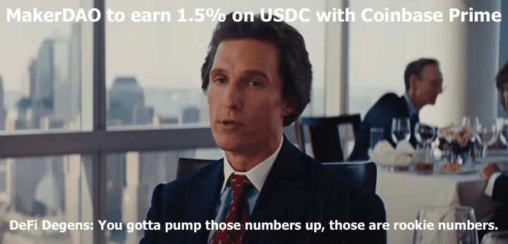 - MakerDAOÂ has approved a proposal to custody up to $1.6B in USDC with Coinbase Prime to earn a 1.5% yield.