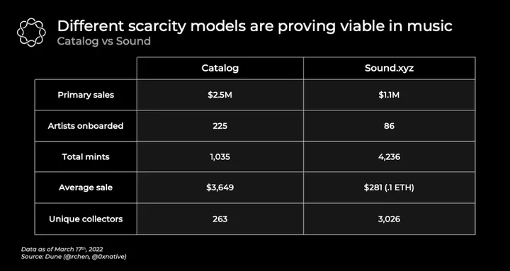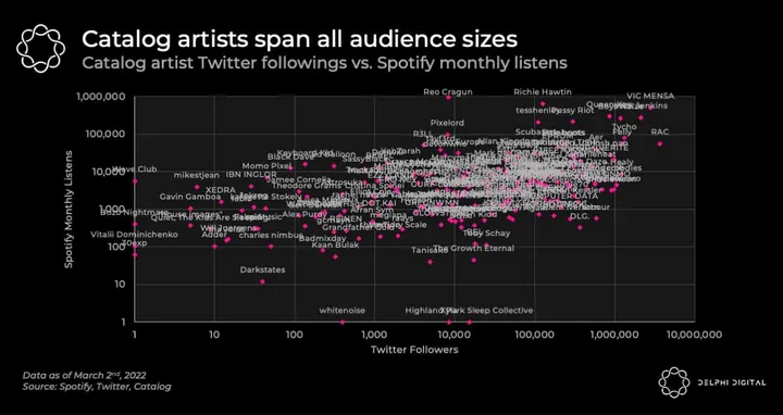 Stories like Allan’s are increasingly common. According to a Delphi analysis, the median artist on Catalog has 16k monthly Spotify streams and 3300 followers on Twitter, which indicates the bulk of web3 musicians are currently indie or unsigned.