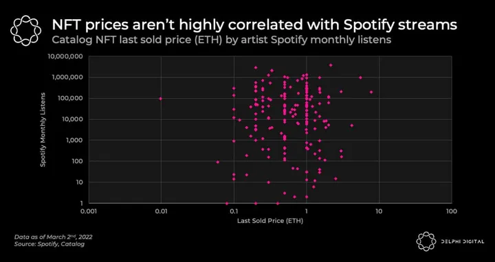 Surprisingly, artist popularity on Spotify has not correlated strongly with sales on Catalog. Sales have tended to clump around ~1 ETH, without a ton of variation based on Spotify monthly streams. This suggests that early collectors are willing to support less established artists and are putting a premium on the “firstness” of early-adopter musicians.