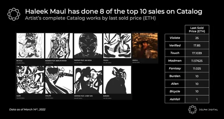A notable indie case study is Haleek Maul, a Barbados-raised rapper who sold 9 works on Catalog for a combined 133.6 ETH ($299k at the time of writing). Maul has sold the top 8 highest-priced pieces on Catalog, mostly ranging from 10 ETH to 25 ETH. The sales from Maul’s INNER EP (56 ETH, or $256k at the time) would translate to 58.7M Spotify streams. Interestingly, Maul’s following on Spotify and Twitter were relatively modest (about 4k monthly streams and 8k Twitter followers), but the artist has leaned hard into web3. Doomsday, a VC-backed production company that crowdfunds music videos via NFTs, has been working closely with Maul with the goal of winning a video Grammy.