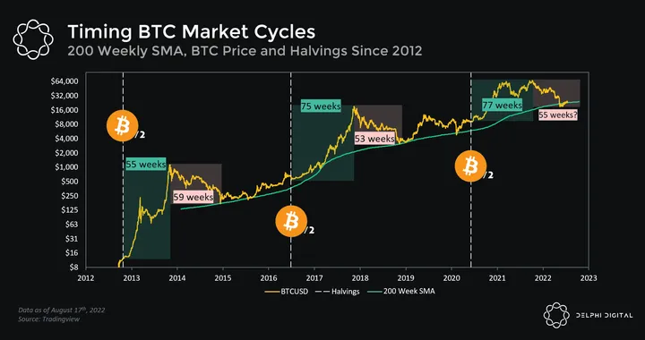 - From the most recent one (May of 2020), we can see that it took Bitcoin 77 weeks to reach this cycle’s top of ~$69,000, in November of 2021. Jumping to the previous halving (July of 2016), it took Bitcoin 75 weeks to reach last cycle’s top of $20,000, in December of 2017. Now when we look at the halving in November of 2012, the pattern slightly falls apart (as it only took BTC 55 weeks to hit that cycle’s top).