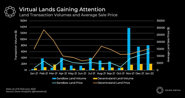 Virtual lands have been in vogue these past few months, catalyzed by Facebook’s recent name change to ‘Meta’ and the announcement of its bold vision for the metaverse. Others like Grayscale have weighed in with estimates that the metaverse may represent a $1 trillion annual revenue market opportunity. Everyone is talking about the metaverse. Just last week, Decentraland outlined its 2022 manifesto, which includes new desktop clients, in-world experience improvements and upcoming content/activities. The chart below shows how virtual land sales in Decentraland and Sandbox have performed.