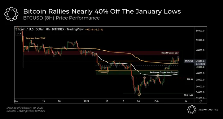 - Since our last edition of Market Insights, bitcoin has notched an extremely impressive week, rallying nearly 20% over the last 7 days and nearly 40% off its January lows (around $33K). This week’s move was a vicious one, sparked by a reinvigorated spot bid across all major exchanges, as well as a flurry of short liquidations as late sellers were mercilessly squeezed. All of this culminated into a nearly 10% move on February 4th. Since the February 4th “chad candle,” price momentum has started to slow for BTC and most other crypto assets.