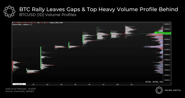 - The “value area,” shown as the highlighted sections of the volume profiles where 68% of BTC volume was transacted, has migrated upwards over the last 10 days, as is typical when you see a sudden move in price. However, this particular move left behind volume gaps, or inefficiencies due to the violent nature of shorts being liquidated. This immediately becomes an area of interest as price often reverts to fill in market inefficiencies over time (note: we’re planning to do a deeper dive on market structure and the theories behind this soon for those interested).