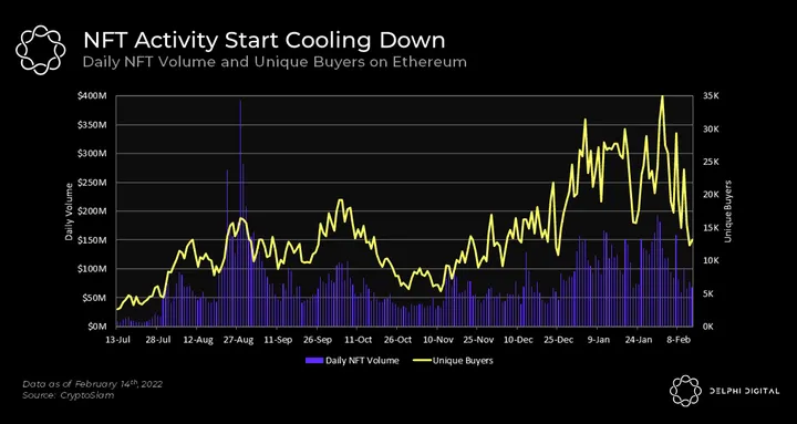 - The year started with a booming NFT market as high-profile projects like BAYC generated headlines from rapid celebrity adoption. However, the party seems to have slowed down somewhat, with volume and unique buyers trending lower over the past week.