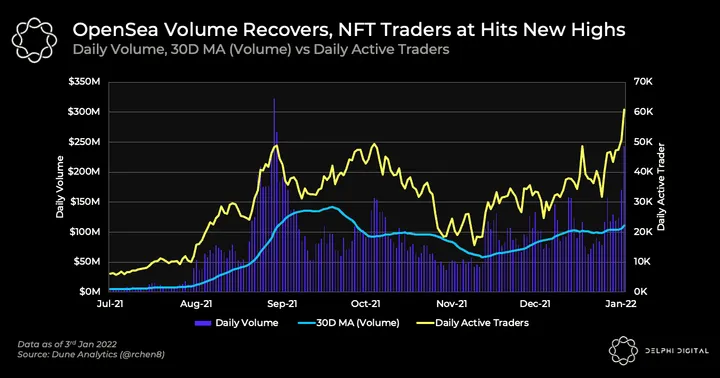 - OpenSea volume is showing recovery signs as volume starts to trend upwards. Yesterday alone, daily volumes hit near $250M, the highest it has ever been since the peaks of Sep. 2021. Alongside that, it was also the platform’s most actively traded day yet in terms of users, hitting a new high of 60K daily active traders.