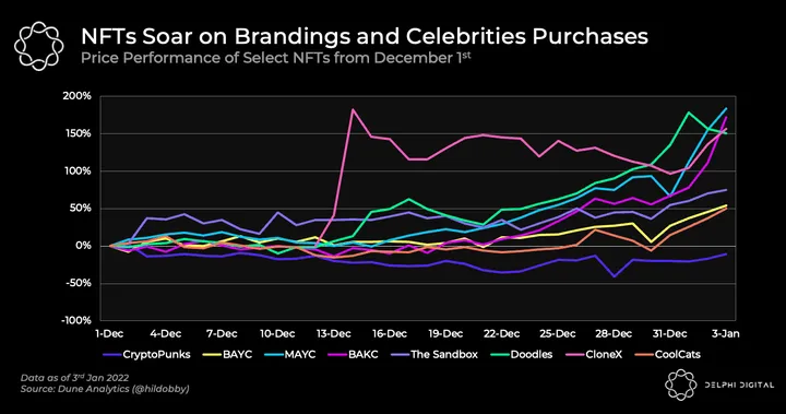 - While it might have looked gloomy for the wider crypto markets, the NFT market had it good the past month. Dec. started out with Metaverse real estate from Sandbox soaring, triggered by Softbank and Adidas’s purchase.