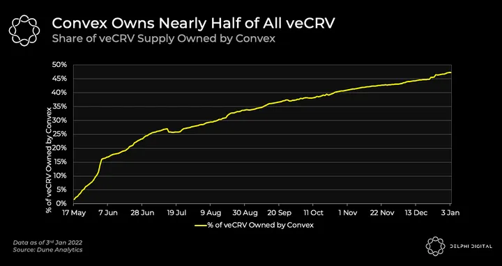 - In April 2021, Convex pioneered this bribing game with a 1% airdrop in exchange for support from veCRV holders. Now, it has grown to have great sway on Curve’s valuable governance vote: 85% of Curve TVL is now routed and staked via Convex. And nearly half of all veCRV supply is owned by Convex (more on that below).