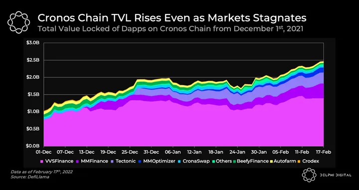 - Since December, Total Value Locked (TVL) on Cronos has grown from $1B to near $2.5B today, a whopping 2.5x despite uncertain market conditions.