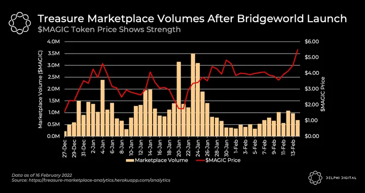 - Bridgeworld: In addition to Atlas Mine, Questing (6 Feb) and Crafting (12 Feb) mechanics have now been activated. The base entry point to play the game is a Legion NFT. Auxiliary Legions are at a floor price of 1,400 $MAGIC (~$7,600) while Genesis Legions are at a floor of 15,500 $MAGIC. Notably, Genesis Legions have appreciated considerably over the last two weeks in $MAGIC terms; when denominated in USD, their rise is even more impressive, considering MAGIC’s price has run up ~40% over the same period.