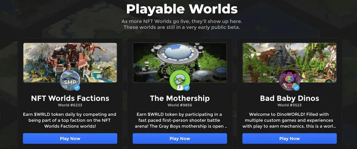 - Games on NFT worlds. There are 14 games currently available, which are largely mini-games or PvP survival / Battle Royale-type games. You do not need an NFT World NFT to play these games. To get started: