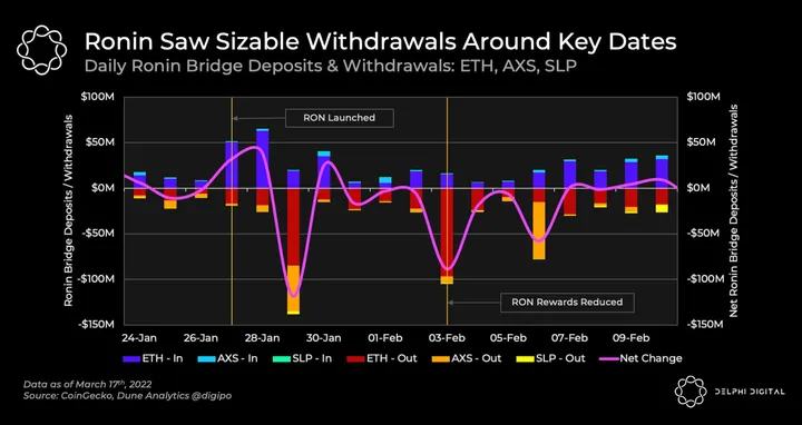 - Zooming in on the Axie Ronin bridge, we can see there was significant bridge activity around a couple of key dates. Although the Ronin bridge and Katana are not one and the same, with the limited things one can currently do with capital on Ronin it’s safe to assume major changes on Katana can be seen in the Ronin bridge data. Firstly, RON launched on Jan. 27th, and what we see is a net inflow of funds to Ronin that day and the following, presumably wanting to purchase newly released RON. The following day on the 29th, there was a significant spike in withdrawals equating to almost $150M withdrawn that day. It seems plausible that it was the result of RON farmers taking profits as their tokens were unlocked a couple days before. This is supported in the previous chart where we see a coinciding spike in volume on the 27th and 28th, indicating a change of hands. The second key date was Feb. 3rd, when RON farming rewards were cut heavily as per the rewards schedule. In this instance, a withdrawal of over $100M happened that day. This is likely the result of mercenary capital moving funds elsewhere the moment RON reward reductions came into effect.