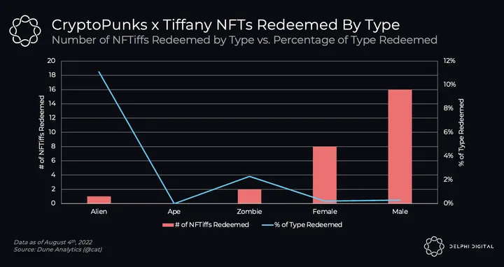 - Out of the 100 NFTiffs that were minted, 27 have already been redeemed. The CryptoPunks that redeemed these NFTs include 1 Alien, no Apes, 2 Zombies, 8 Females and 16 Males.