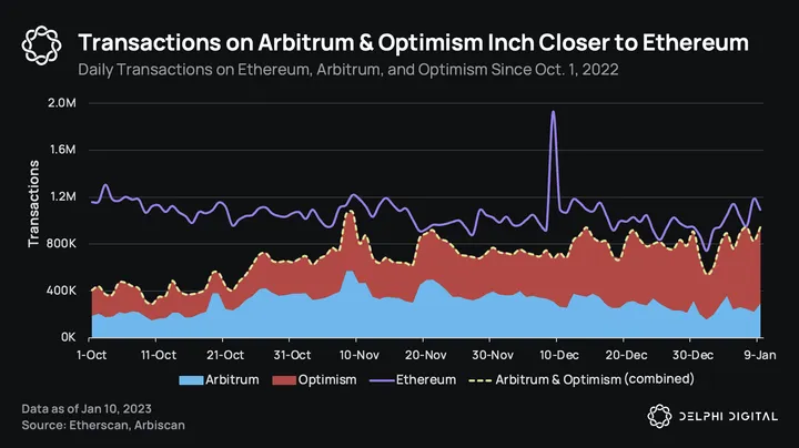 - On Jan. 7, the combined daily transactions on Arbitrum and Optimism totaled 942K, only 16K transactions short of Ethereum’s 958K.