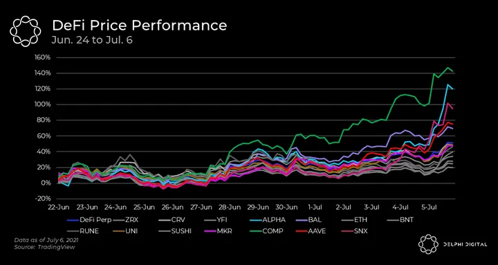- The run up was long overdue after relentless selling through May and June. But it’s important to note that this may just be relief rally as selling exhausted. The next couple of weeks will be telling for DeFi, and the crypto market in general.