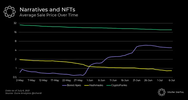 - Take for example, Bored Apes Yacht Club and Hashmasks. While the hype for Hashmasks was strong into its launch, it’s narrative and use as an avatar has been underwhelming. The average sale price fell from over 5 ETH in Feb. 2021 to less than 0.8 ETH today.
