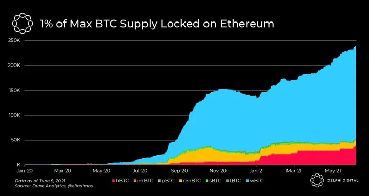 - 1% of all BTC that can ever exist is currently locked on the Ethereum blockchain. WBTC continues to lead the way and expand its market share with 79% of all BTC on Ethereum.