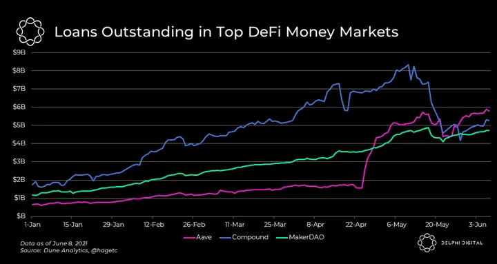 - Leverage in DeFi excludes high-risk derivatives positions, which possibly explains the stickiness of borrowers. As low risk stablecoin farmers look to deposit for yield in Aave, and higher-risk farmers borrow from Aave to farm on Curve and elsewhere, DeFi money markets are proving to be resilient.