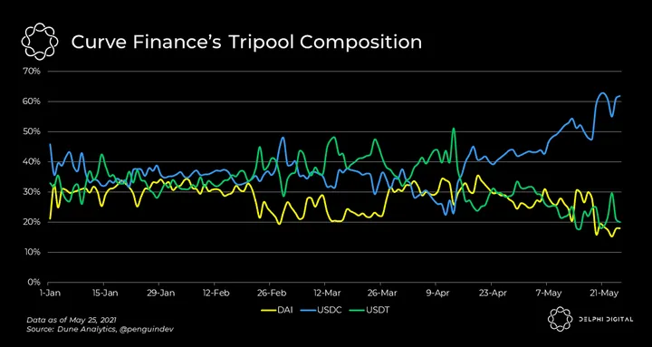 - Curve Finance’s tripool — its largest pool by volume and liquidity — has seen a sharp increase in USDC since April with DAI and USDT’s share shrinking.