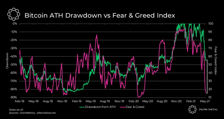 - Comparing Bitcoin’s historical drawdowns to all-time highs versus the Crypto Fear & Greed Index (o = extreme fear; 100 = extreme greed) is a rough proxy for gauging market sentiment.