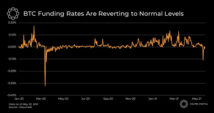 - The average funding rate across top derivatives exchanges, pictured below, didn’t fall as hard as March 2020 and recovered faster. This potentially indicates that sentiment in the perp market has already improved.