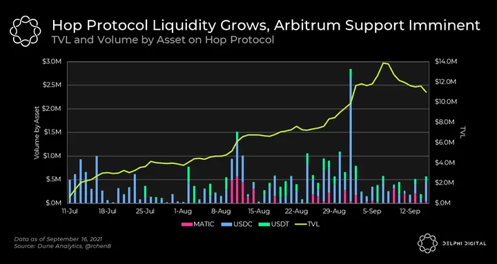 - Hop Protocol is a cross-chain liquidity product that enables seamless interaction between L1s and their rollups. The protocol has grown its liquidity by a fair amount in the last month without any token incentives. Assets supported are currently restricted to USDC, USDT, and MATIC. Hop currently offers users the ability to move assets between Ethereum, xDAI, Optimism, and Polygon.