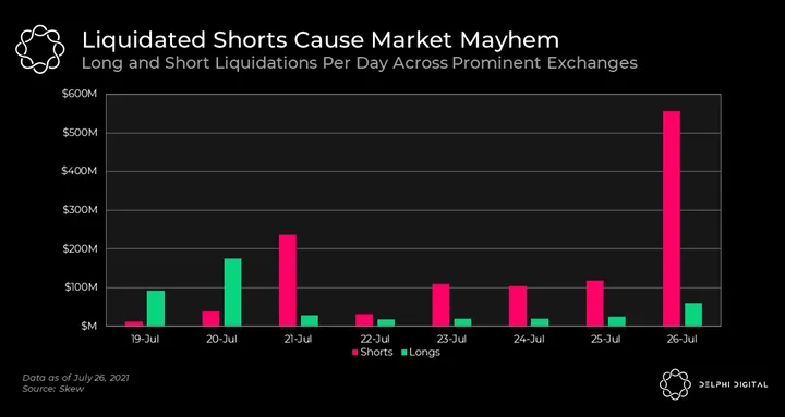- After months of watching longs get liquidated for tens of billions of dollars, it was the shorts’ turn to incur the wrath of the market. A massive short was liquidated on Binance, pushing the price of it’s BTC-USDT perpetual future from $36,710 to $48,110 in two minutes. Yes, two minutes. On other exchanges, like Coinbase’s spot market, the price of BTC barely reaches $40,000.