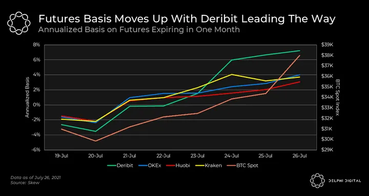 - Deribit’s increase in basis boils down options market maker’s on the exchange being forced to hedge by buying futures. Market makers provide liquidity to options where there’s demand from buyers. Given the surge in demand for $40,000 calls, market makers who wrote these options are left exposed if BTC continues to rip. Since they wrote (sold) calls, they have an obligation to sell BTC to the option buyer if market price is above the strike price at expiry. To reduce this risk and hedge their position, these market makers buy futures (which is like buying spot BTC for a future date).