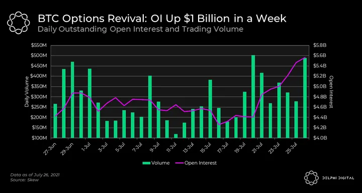 - Open interest is up from $4.2 billion last week to nearly $5.6 billion now. Options trading volume, which has been fairly consistent through July, recorded over $450 million worth of trades today alone.
