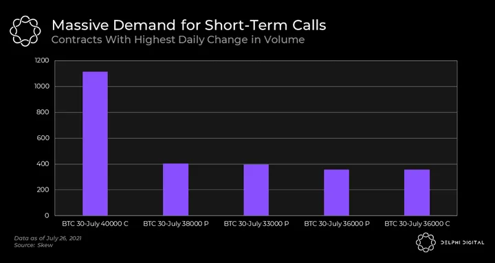 - A surprising amount of volume was generated by a whale who made it their life mission to stock up on $40,000 BTC calls that expire at the end of this week. This had some major implications on the futures market, which we’ll get to in a minute.