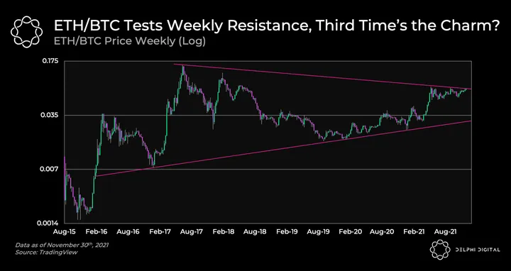 - ETH/BTC is testing the upper trend line for the third time in the past year. ETH/BTC has shown considerable strength as of late, having mostly stayed around the upper bound of its established range. The last time it tested the lower trend line was in Dec 2020. It’s worth noting the data snapshot in the above chart is a few hours stale. ETH/BTC has since made a run above the upper trend line. What’s key now is to watch for whether this is a fakeout (bull trap) or whether it can find acceptance and consolidate above the trend line.