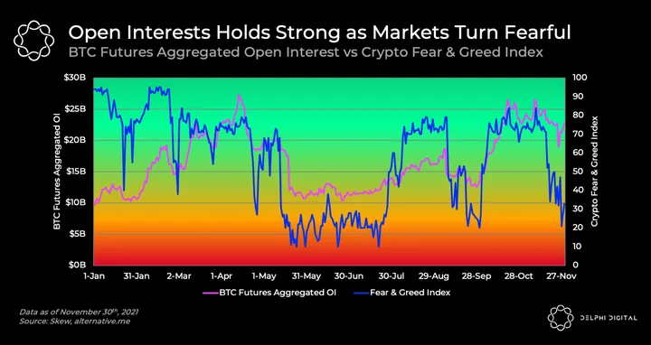 - Crypto markets have been ravaged by fear in the past month, but futures traders seem to be unfazed by it. With BTC retracing the past week, open interest dipped from ~$23B to ~$19B. At the same time, the Fear & Greed Index nearly hit a state of extreme fear. However, open interest bounced back hard within a few days to levels seen prior to the drawdown. However, sentiment in the market continued to be fearful.