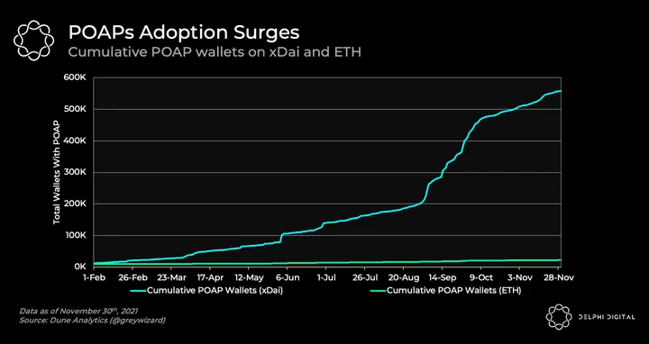 - Over the past 3 months, wallets containing POAPs grew exponentially from ~200K to nearly 600K, with thousands more being added daily. Given Ethereum transaction fees are expensive, the vast majority of POAP minting occurs on the xDAI network.
