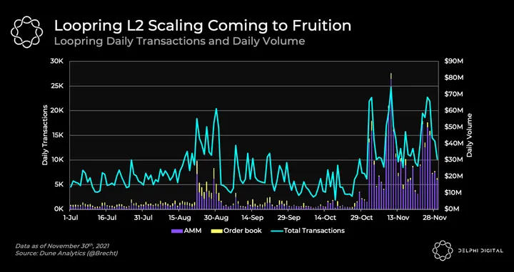 - Loopring is a ZK-rollup, purpose-built for AMM swaps and orderbook trades. Loopring’s activity has been trending upwards alongside volumes since October. Trades on Loopring are gas-free, which helped the L2 gain traction and surpass $3B in cumulative volume recently.