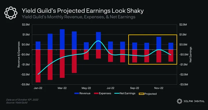 - With the exclusion of June 2022, no other month has been net profitable for the guild this year. Yield Guildās forward-looking earnings projections through year-end donāt give much hope for relief either.