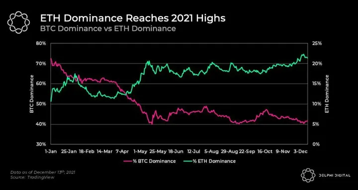 - ETH and BTC have both performed well in 2021. However, as the year went on ETH edged out BTC, as reflected by market cap dominance. ETH’s dominance went from ~11% at the start of the year to ~21% today. BTC dominance on the other hand started at ~73% and is at ~42% today.