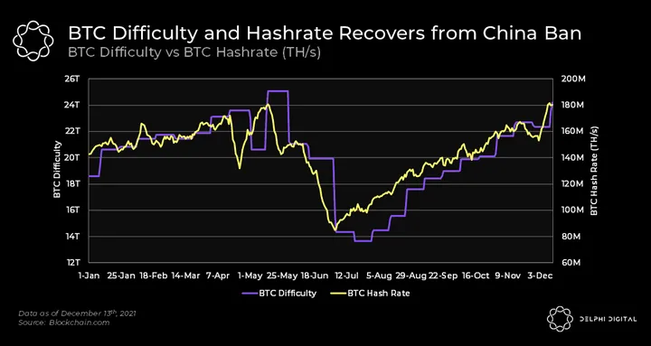 - When China banned cryptocurrency mining, BTC difficulty and hash rate plummeted as mining farms were forced to close. The ban had severe implications for the overall Bitcoin network, as 50% of the network’s hash rate was removed as it swiftly dropped from ~180M TH/s to ~85M TH/s.