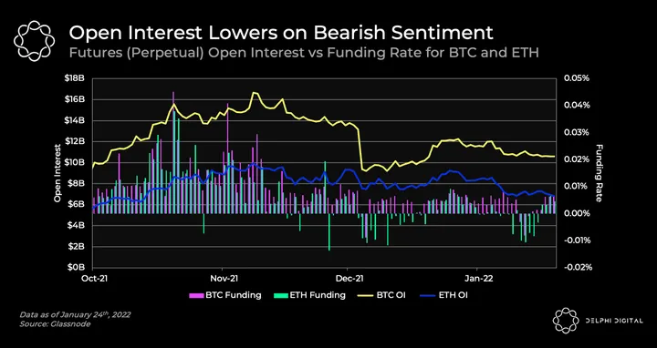 - Open interest moved down as the markets turned bearish from hints of impending rate hikes. BTC and ETH futures OI have contracted by $6B and $3.1B, respectively, since their peaks in November.