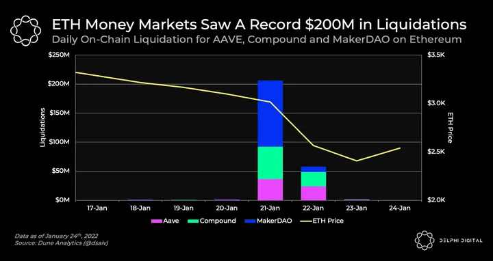 - Over the last Friday, money markets on ETH experienced their largest liquidation event to date, amounting to over $200m. MakerDAO was responsible for more than 50% of liquidations.