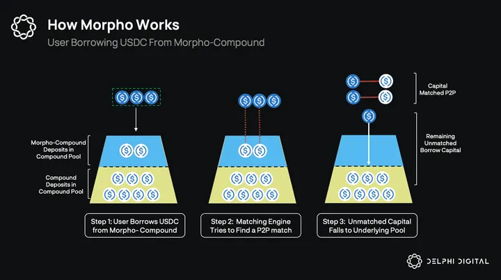 - To illustrate this, imagine a borrower taking a loan from Morpho-Compound. Morpho’s matching engine automatically tries to find a counterparty to match the user’s loan.