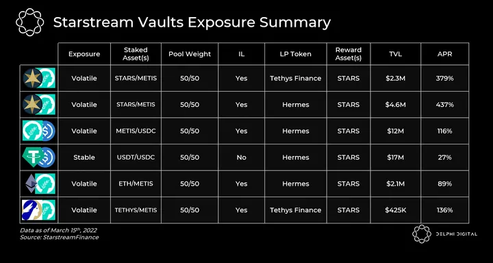 Yield calculations are provided by Starstream. To access Starstream, you’ll need to configure your MetaMask to run Metis Andromeda’s Mainnet using this guide.