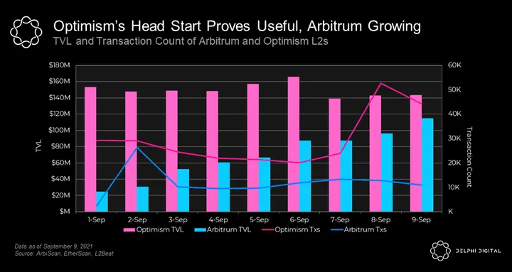 - Optimism enjoyed a month-long head start over Arbitrum and has consequently seen more traction, but Arbitrum’s open ecosystem and deployments could be the spark that propels long-term growth. Optimism had a 50K daily transaction limit on launch, but that doubled to 100K in late August.