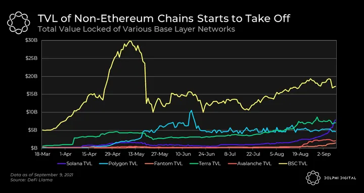 Non-Ethereum L1s have grown significantly this year, as evidenced by Solana and Terra’s large additions to TVL in recent months. Likewise, Avalanche and Fantom appear to be attracting more capital on the back of their incentive programs. The growth curve for Solana, in particular, looks the most exciting with the chart almost vertical at this point.