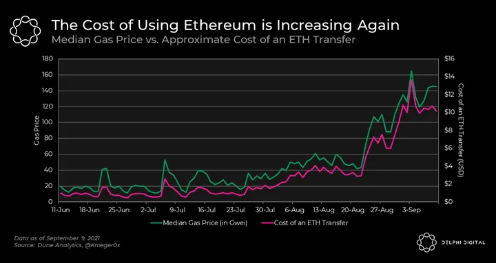 - It costs $10 to do a simple ETH transfer again, and median gas is now up to 150 gwei with occasional spikes to 1000-5000 gwei (not a typo). For most users, even transferring ETH across the network is no longer viable.