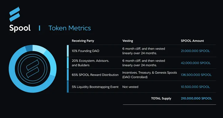 - 20% (42M SPOOL) has a 6-month lock and then will be vested linearly over 24 months by the Ecosystem, Advisors, and Builders