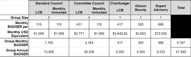 - The council remuneration consists of two parts, 1-year locked BADGER and a monthly stipend. The breakdown below was presented in the forum.